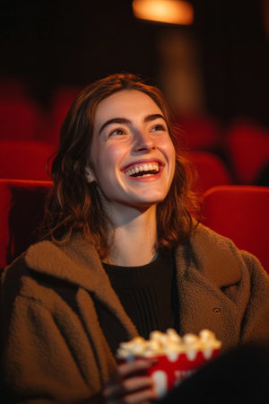 A Caucasian woman, sitting in a cinema seat, grinning broadly while eating popcorn during a funny scene in a movie comedy. The surrounding theater is dimly lit, with only the light from the screen illuminating it.
