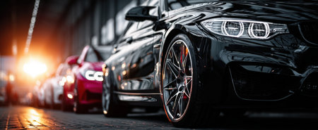 Black sports car with polished wheels is positioned next to a red vehicle, highlighting contemporary automotive aesthetics and urban ambiance with dramatic lighting