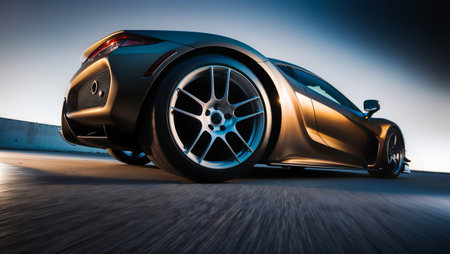Performance Vehicle During Sunset. Sporty Looking Exotic Car Alloy Wheel Close Up. Automotive Theme.