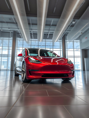 Red sports car is shown in well-lit area with headlights and taillights both on. Generative AI.