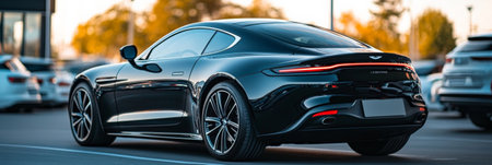 New black sports car parked in a sleek dealership parking lot, surrounded by other vehicles, reflecting the warm hues of the sunset and showcasing its modern, luxurious design