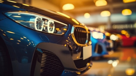 Close up of New cars display in luxury showroom with light bokeh in motor show event.