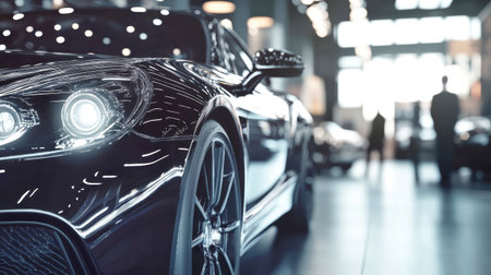 Elegant black luxury cars shine in a stylish auto showroom as potential buyers converse with salespeople, eyeing their next test drive.