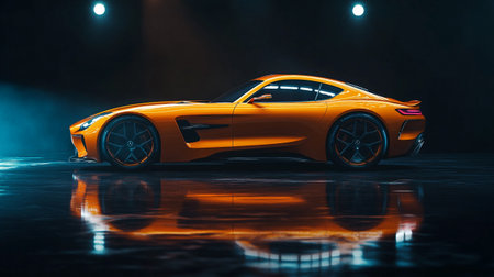 A sleek, modern sports car is dramatically showcased within a futuristic architectural environment, illuminated by vibrant neon lighting. This eye-catching digital art render features a luxury automobile with a glossy metallic finish, highlighting its stylish design and performance capabilities. The dynamic composition, with blue and pink neon reflections, creates an abstract and eye-catching background. Perfect for automotive design, technology, and urban lifestyle concepts, this image is ideal for marketing materials, website design, and creative projects.