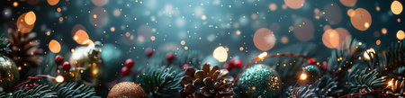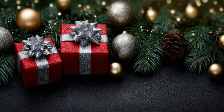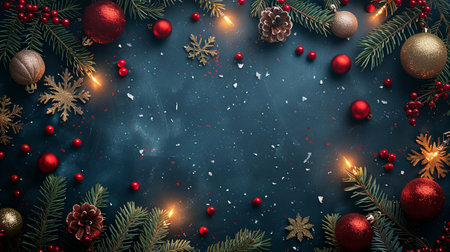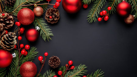 Festive background featuring snowflakes, Christmas baubles, and pine branches on a dark surface, perfect for holiday greetings