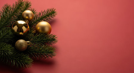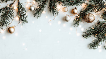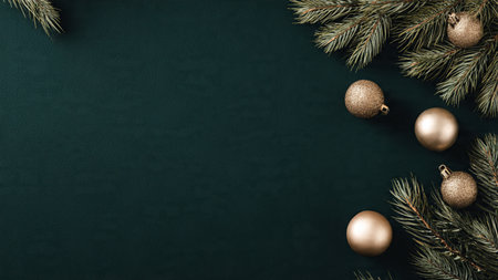 Elegant minimalist holiday background with pine branches and ornaments.