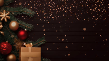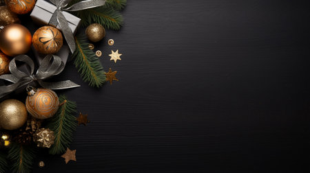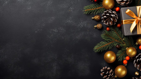 Generative AI : Festive Christmas dark black background layout with beautiful texture and Golden gift box with red ribbon fir branches stars top view copy space