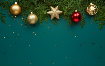 Festive Christmas border with gold and red ornaments, pine branches, star on teal background. Holiday flat lay.