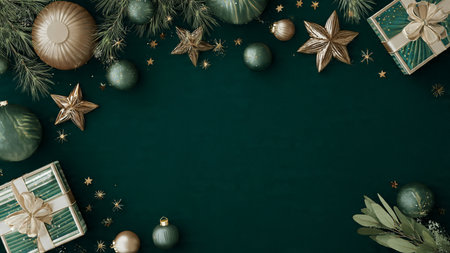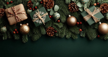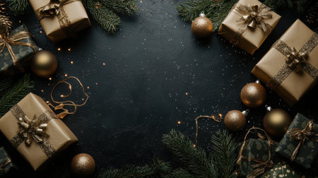 A top-down view of a beautiful Christmas flat lay with presents, fir branches, and shiny balls, providing ample space for a festive message or creative design.