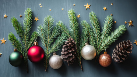 A festive overhead view of Christmas decorations including fresh fir branches, pinecones, colorful baubles, and gold star confetti on a dark textured surface.