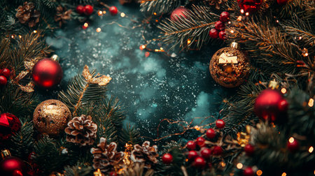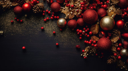 Christmas decorations with red baubles and berries on lush green pine branches. The dark green glittery background adds elegance to the festive composition.