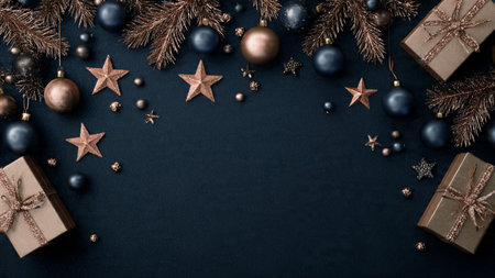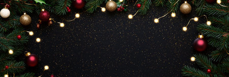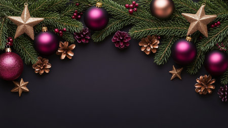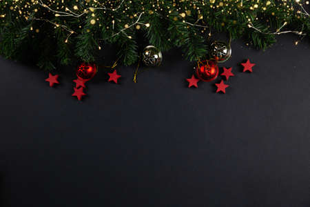 Christmas banner. Black Xmas background with pine tree branch decorated cooper color balls and stars. Christmas frame, greeting card template, web banner mockup. Flat lay, top view, copy space