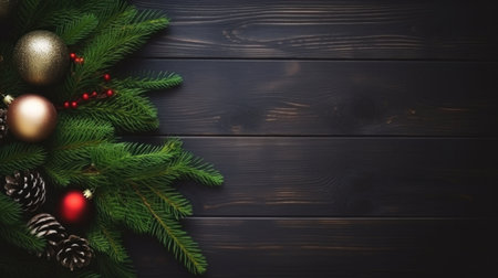 Christmas background with fir branches and baubles on dark wooden board