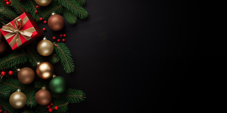 Christmas ornaments and fir tree branches on black background.