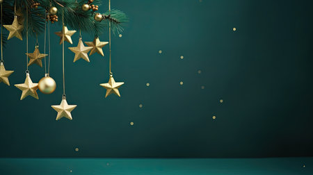 Festive Christmas scene with fir branches, gold stars, and soft glowing lights, perfect for holiday spirit.