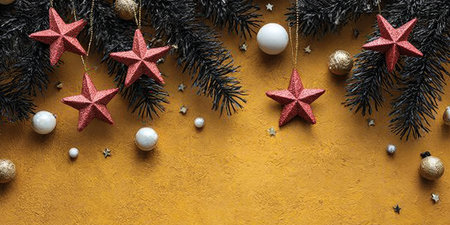 A festive arrangement of green Christmas tree branches adorned with red and gold ornaments and star decorations, set against a light gray textured surface.