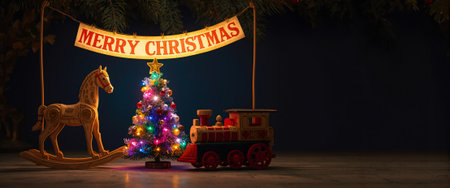 Whimsical Christmas scene with glowing miniature tree, wooden rocking horse, toy train, and Merry Christmas banner. Perfect for holiday marketing, greeting cards, and seasonal campaigns.