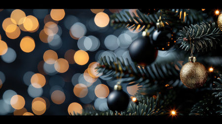 Capture the essence of the holiday season with this close-up image of Christmas tree branches featuring elegant ornaments and a twinkling bokeh background.