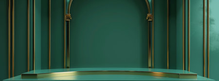 A stylish, green podium with sleek curves against an intricate, archadorned backdrop. Ideal for showcasing products or delivering presentations in a professional, elegant setting