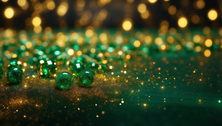 Shimmering green glitter surface with blurred bokeh lights creating a sparkling and festive atmosphere, perfect for celebrations or luxury themes.