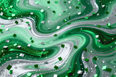 AI generated images. Green and silver swirls and conffeti. Christmas background.