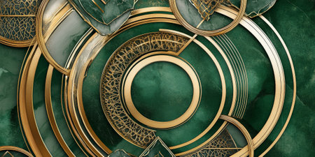 Luxurious emerald green and gold circular geometric design with intricate accents.