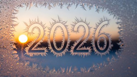 Frosted window with 2026 numbers reveals a sunrise and winter landscape. Clear details and vibran...