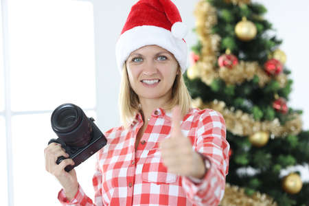 Woman photographer in santa claus hat on background of christmas tree makes thumbs up gesture