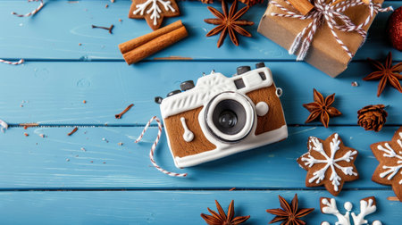 A charming cookie shaped like a vintage camera sits on a vibrant blue wooden table, surrounded by spices, festive decorations, and holiday gifts, evoking warmth and creativity.