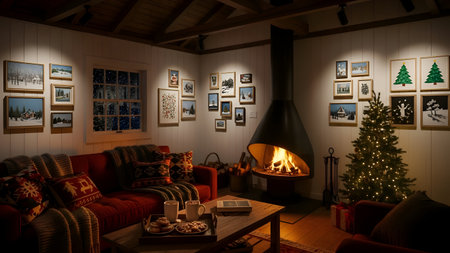 A warm and inviting living room decorated for Christmas with a festive tree, stockings, and holiday-themed artwork on the walls.