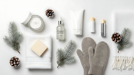Cozy winter skincare essentials and warm mittens arranged with pinecones and evergreen branches