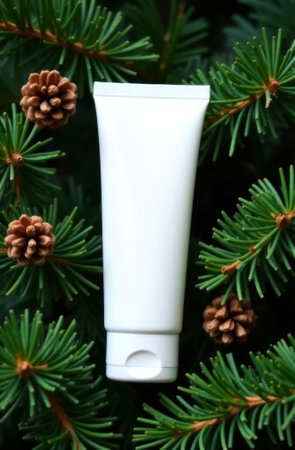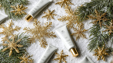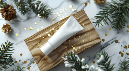 A cream tube with a festive design sits on a table with golden glitter, surrounded by a pine branch adorned with ornaments.