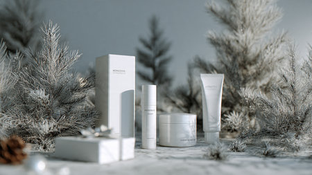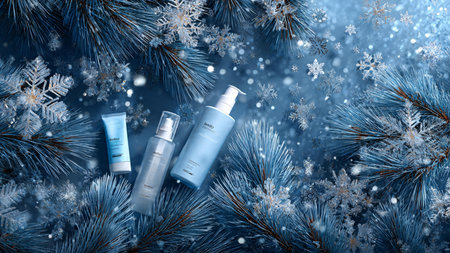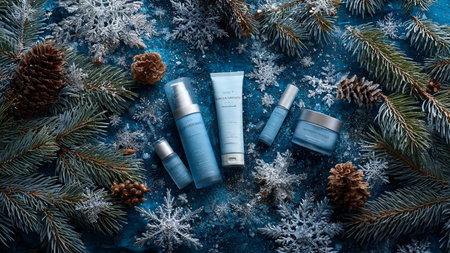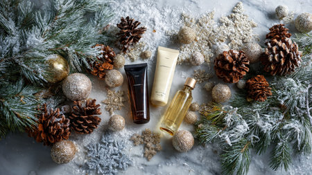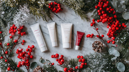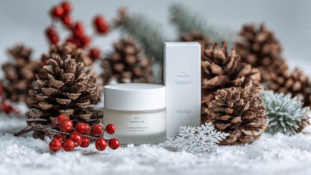 Skincare products and natural winter elements with a soft focus, conveying holiday beauty tips and skin nourishment.