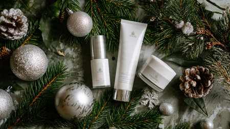 Christmas cosmetics, cream with Christmas decorations, created using Generative AI technology.