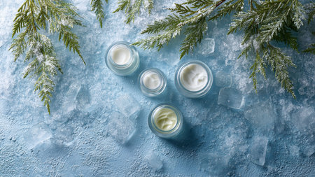 Set cosmetics, jar of winter cream for skin on snowy blue background, closeup. Top view
