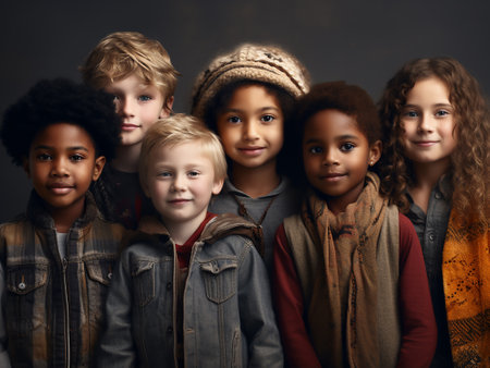 A vibrant group of children stands together, showcasing their casual attire and joyful expressions. This image highlights diversity, friendship, and youthful happiness.