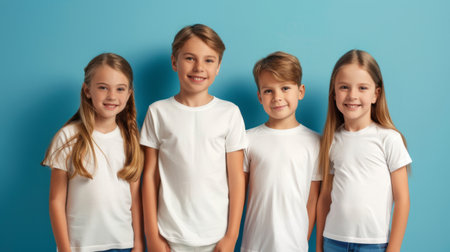 Four children, two boys and two girls, are standing in a row against a blue background. They are all wearing white t-shirts and smiling at the camera.