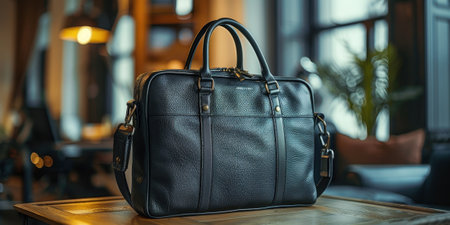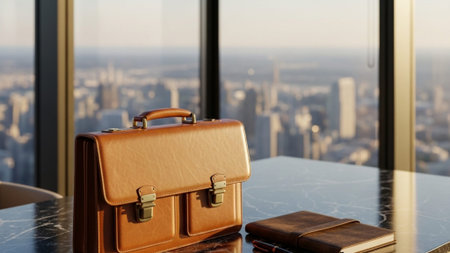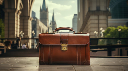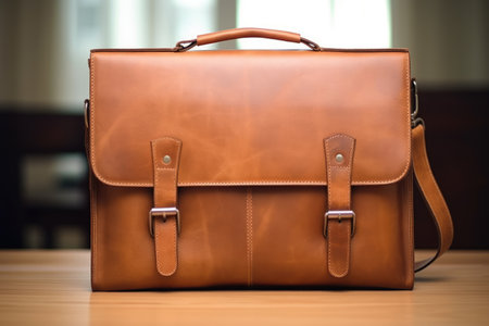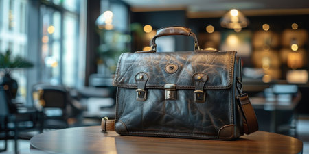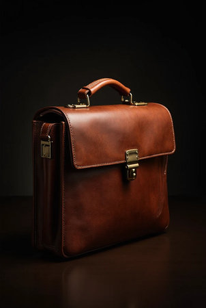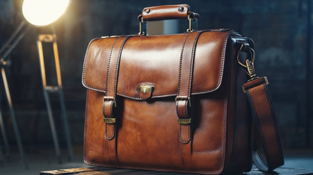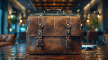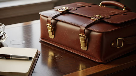 A detailed image features a brown leather briefcase placed on a polished wooden surface. The briefcase is the focal point, with visible stitching and brass clasps. Adjacent to it, a notebook and pen are present. The lighting suggests an indoor setting, and the composition is well-suited for professional and commercial applications.