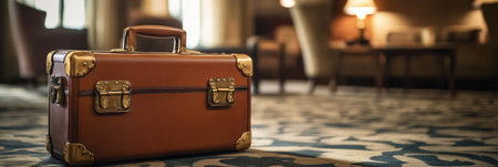 A vintage leather suitcase placed in an elegant, classic interior with warm, ambient lighting.
