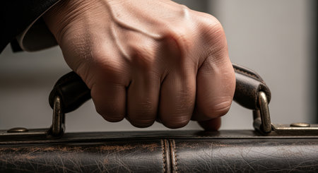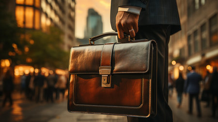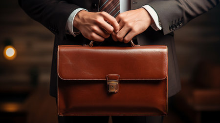 Close-up of a man in a formal outfit holding a luxurious leather briefcase, ready for a business meeting