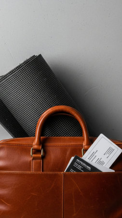 Close-up of a man's leather briefcase on a desk in an office, surrounded by papers and a laptop, symbolizing work and productivity