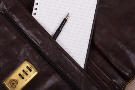 Notebook coming out of an open leather briefcase Vintage Retro Filter.