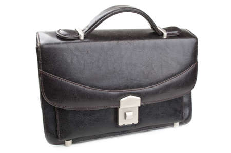 brown genuine leather briefcase with metal clasps, insulated on a white background