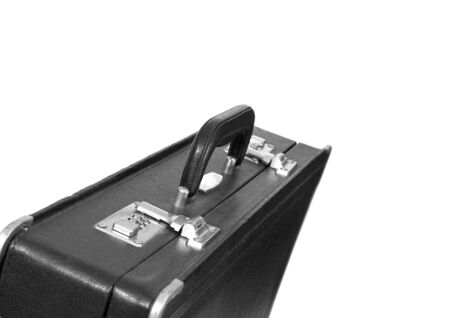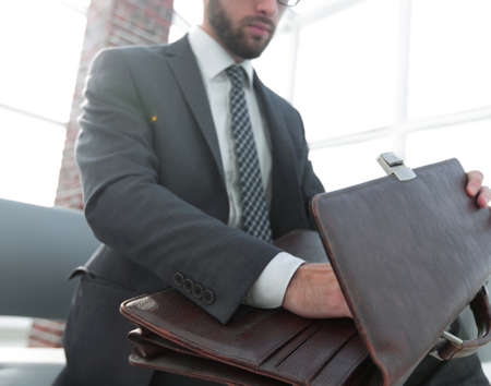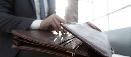 Briefcase with documents in the hand of a business man. The photo is monochrome.