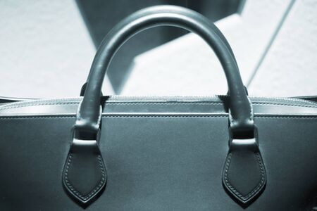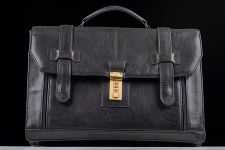 studio lighting. black leather, suitcase, bag, briefcase. On a wooden background. The background is dark. Close-up