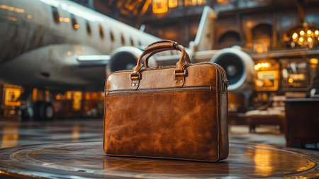 A vintage brown leather briefcase with an airplane blurred in the background, evoking a sense of travel and business.