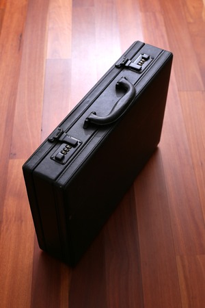 A classic black leather briefcase with a secure metal lock rests on a cold, hard floor, its contents a closely guarded secret.