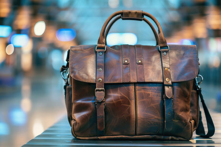 A vintage brown leather briefcase sits elegantly on display in a busy public area, showcasing fine craftsmanship and design. The blurred background emphasizes its classic appeal.