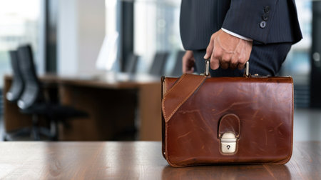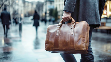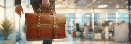 Businessman carrying a stylish leather briefcase in a contemporary office space. Concept of corporate lifestyle and professional business environment.