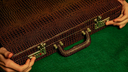 Hands holding a closed brown leather briefcase with a combination lock on a green table